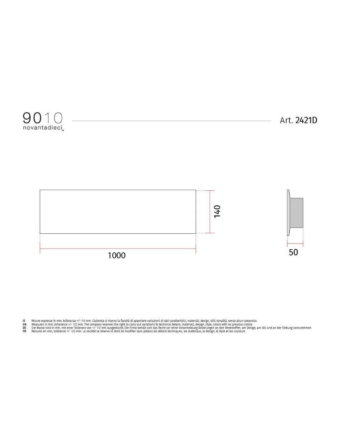 Lampada a parete moderna di forma rettangolare, doppia emissione di luce (verso l'alto e verso il basso), minimo spessore (solo 50 mm), vernicaibile in tinta con le pareti.