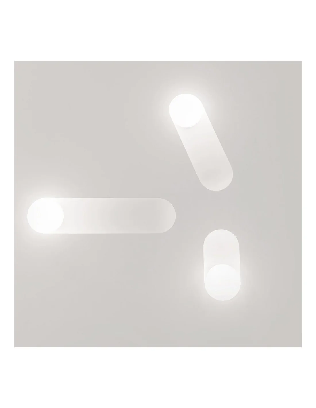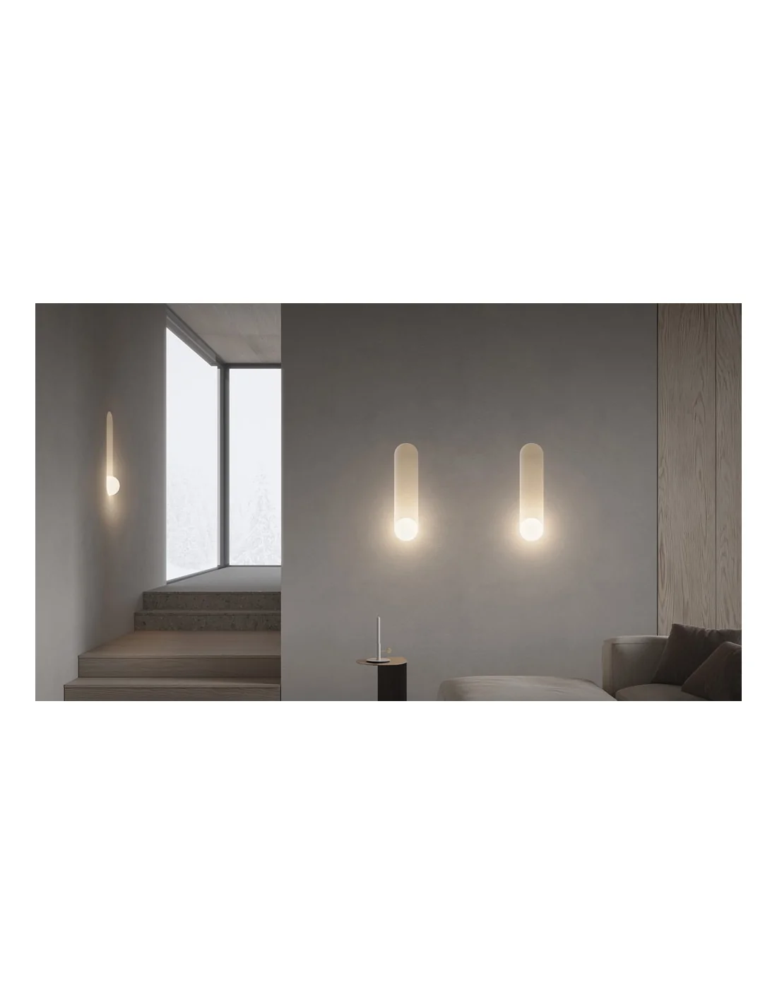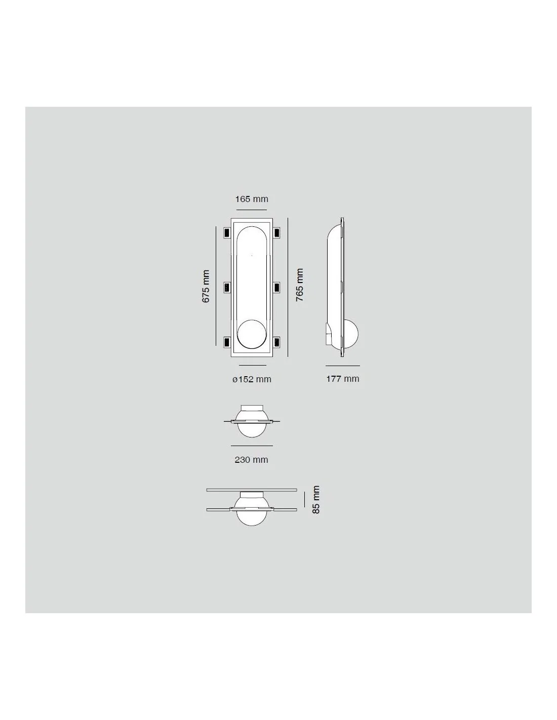 Applique da incasso posizionabile in verticale, orizzontale o obliqua con sfera in vetro che crea un gioco di luce unico, una volta rasata e verniciata si integra perfettamente con la parete e la impreziosisce.