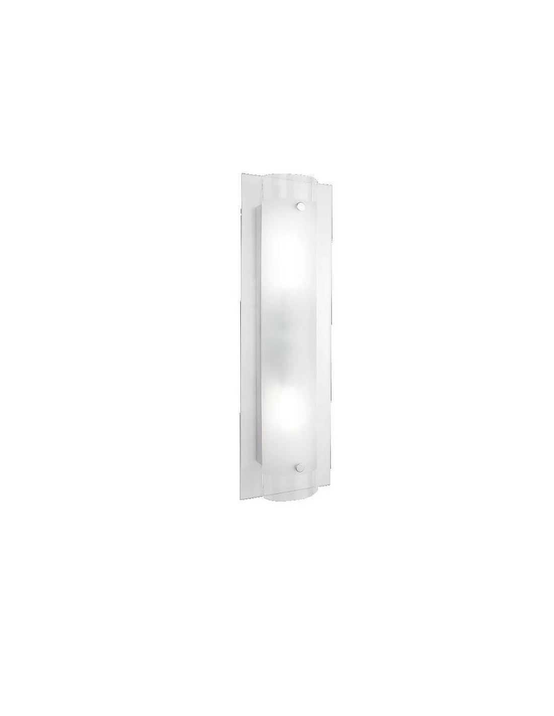 Questa applique delle dimensioni di 40 cm x 12 cm di altezza si presenta con un diffusore composto da cornice in vetro trasparente molato e mezzo tubo in vetro pirex sabbiato nella parte centrale.