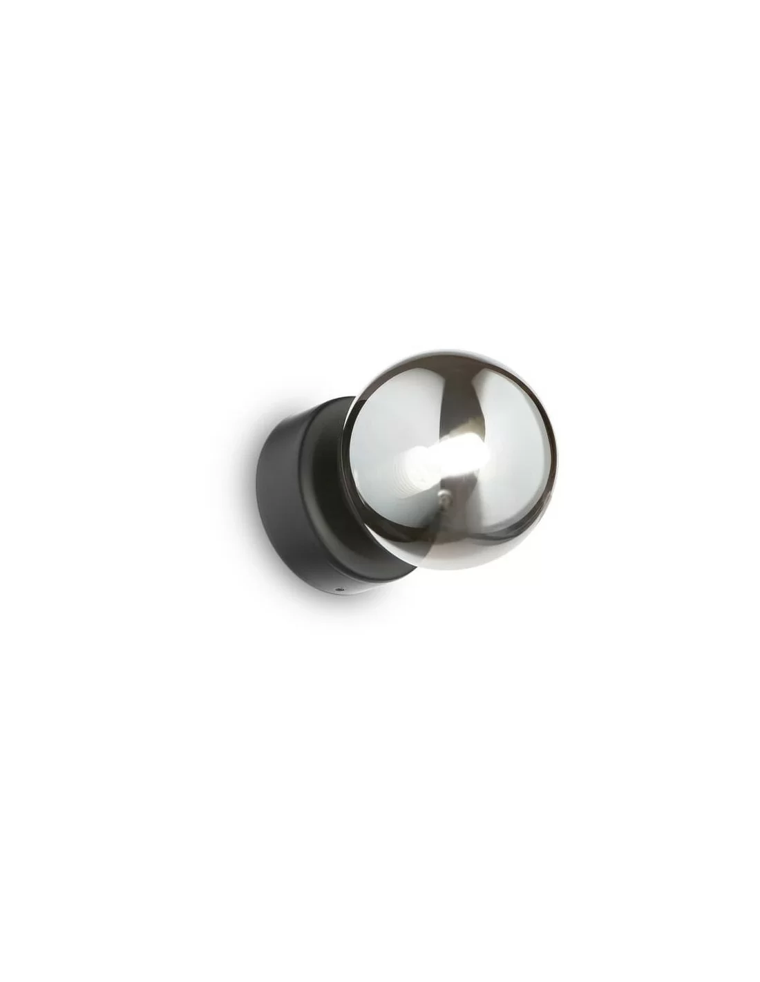 Questa lampada da muro, dimensioni di 13,3 cm x 10 cm, è caratterizzata da una montatura in metallo nero e diffusori in vetro fumè.