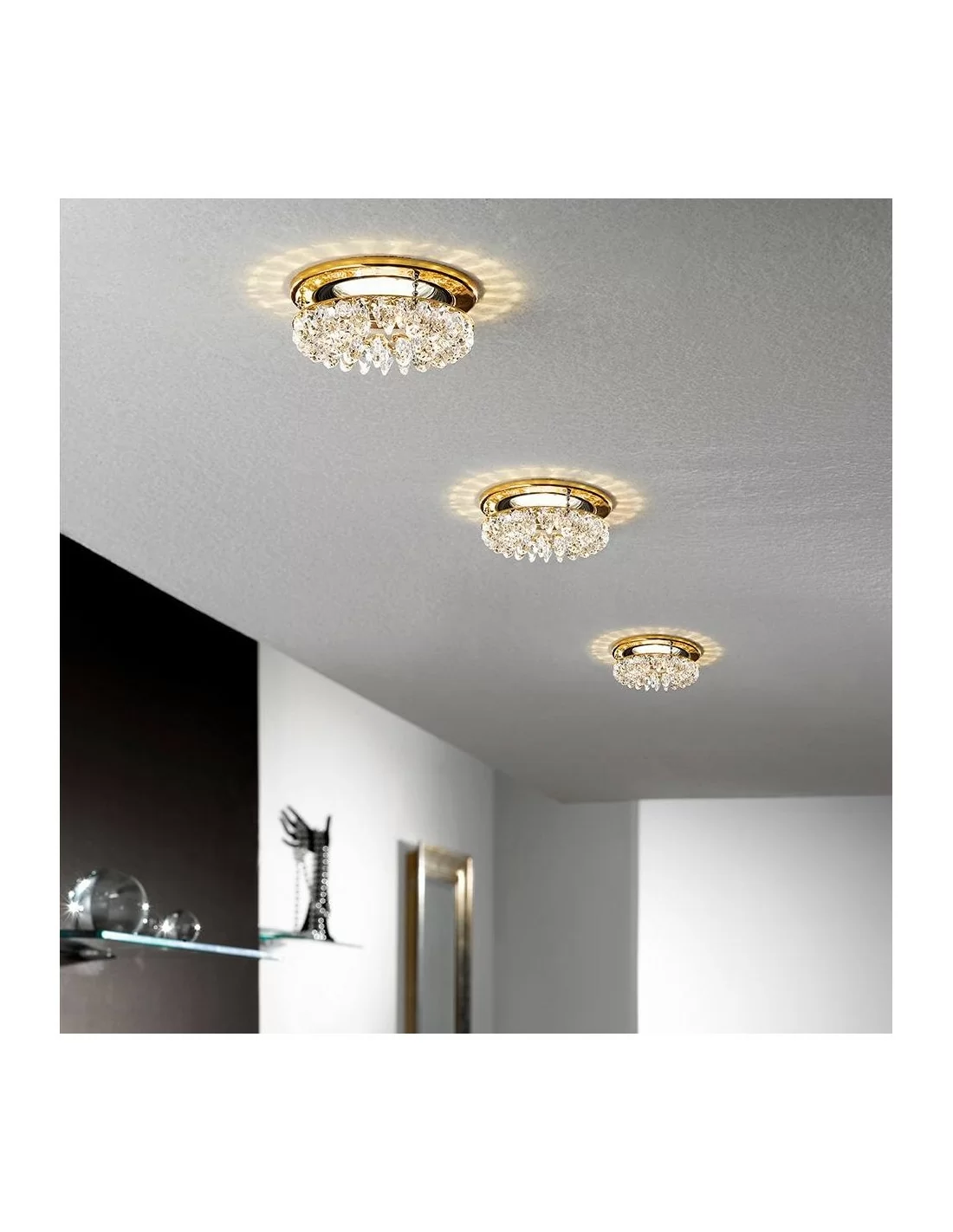 Faretto ad incasso tondo con attacco GU10, foro incasso 7 cm di diametro, con struttura in metallo cromo o oro con pendenti bianchi.