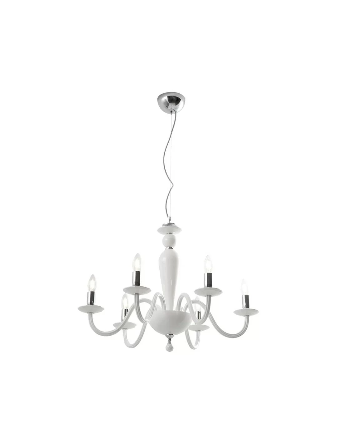 Questo lampadario in stile classico, dimensioni di 70 cm di diametro x 70 cm di altezza, inconfondibile per la sua struttura in vetro lavorato a mano con dettagli moderni in cristallo ottico e in metallo è disponibile nelle seguenti varianti colore: bianco, cristallo, ottanio, rubino.
