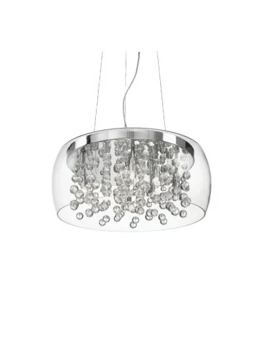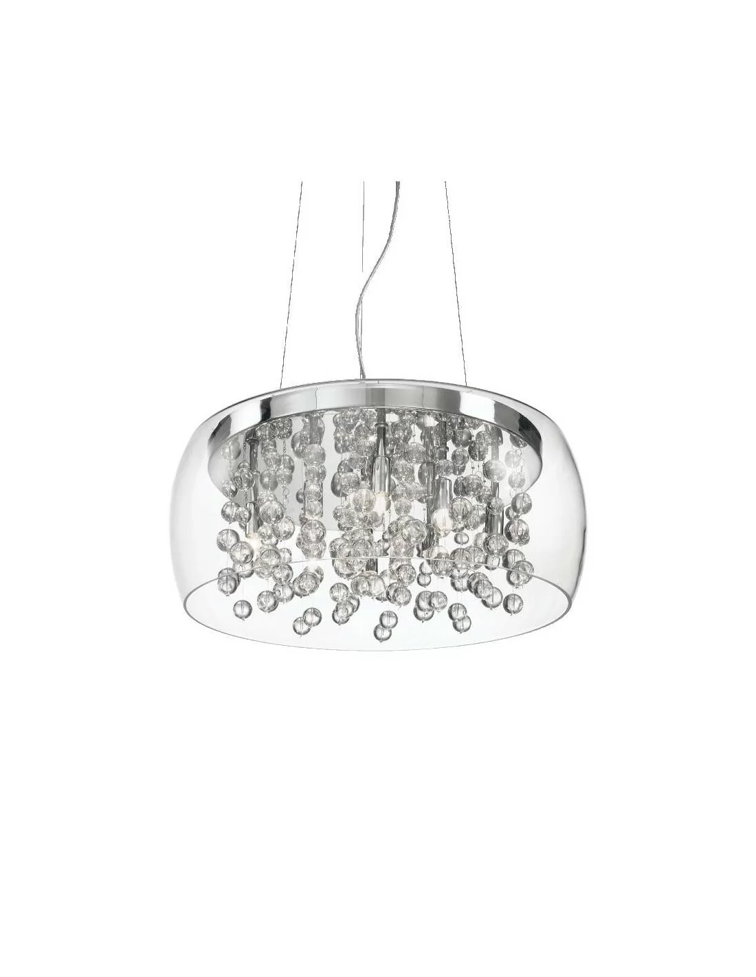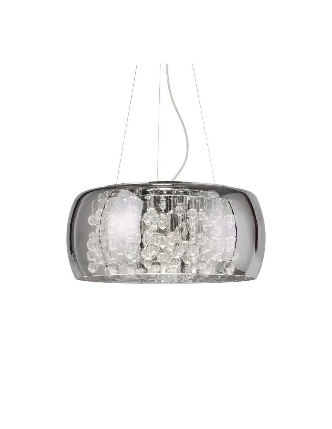 Lampadario dallo stile moderno delle dimensioni di 50 cm di diametro x 220 cm di altezza (cavo incluso) caratterizzato da una montatura in metallo cromato ed elementi decorativi con sfere di vetro su fili di metallo.