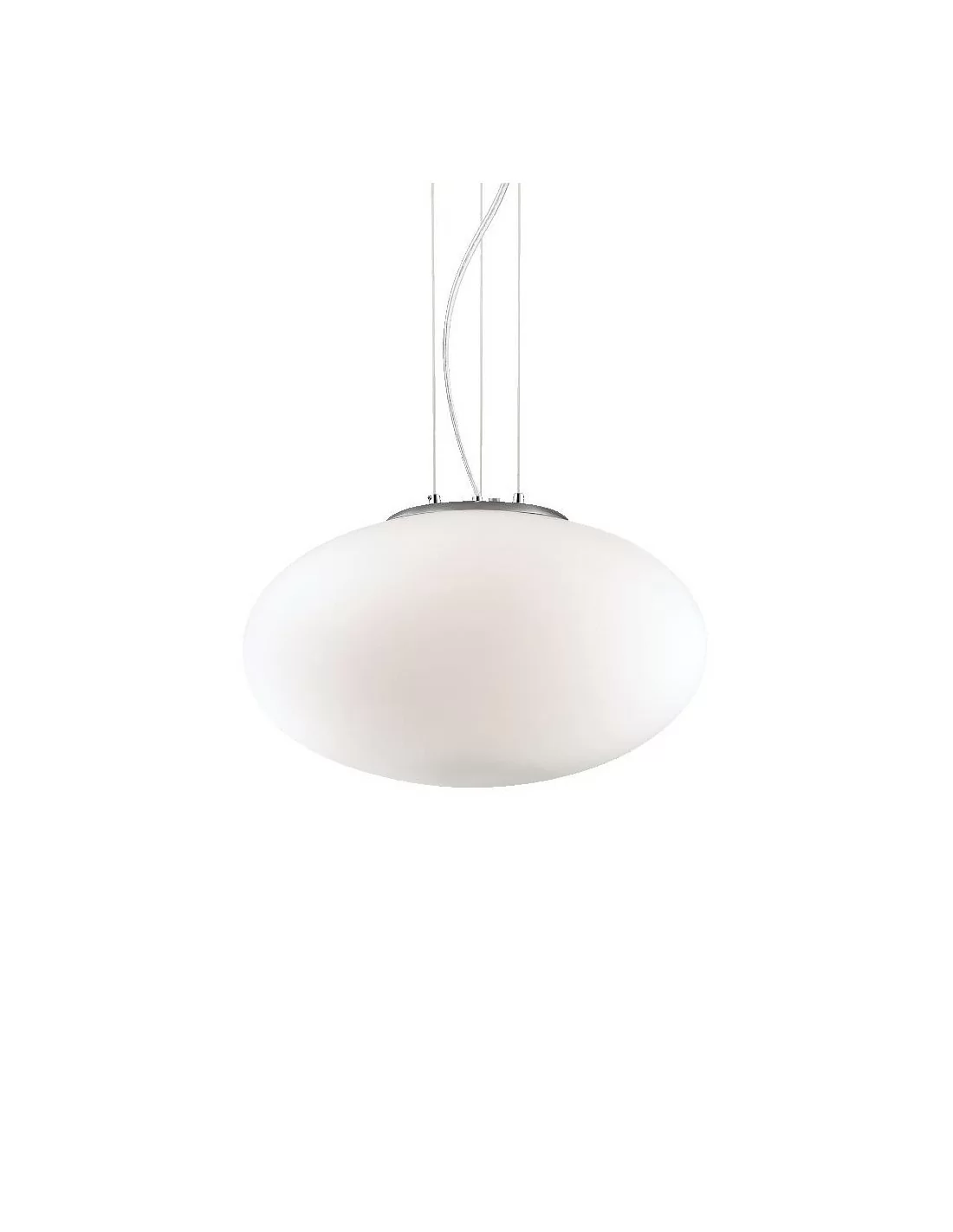 Lampadario moderno delle dimensioni di 40 cm di diametro x 223 cm di altezza ( cavo incluso), con diffusore in vetro bianco soffiato e acidato e montatura in metallo con finitura in nickel satinato.