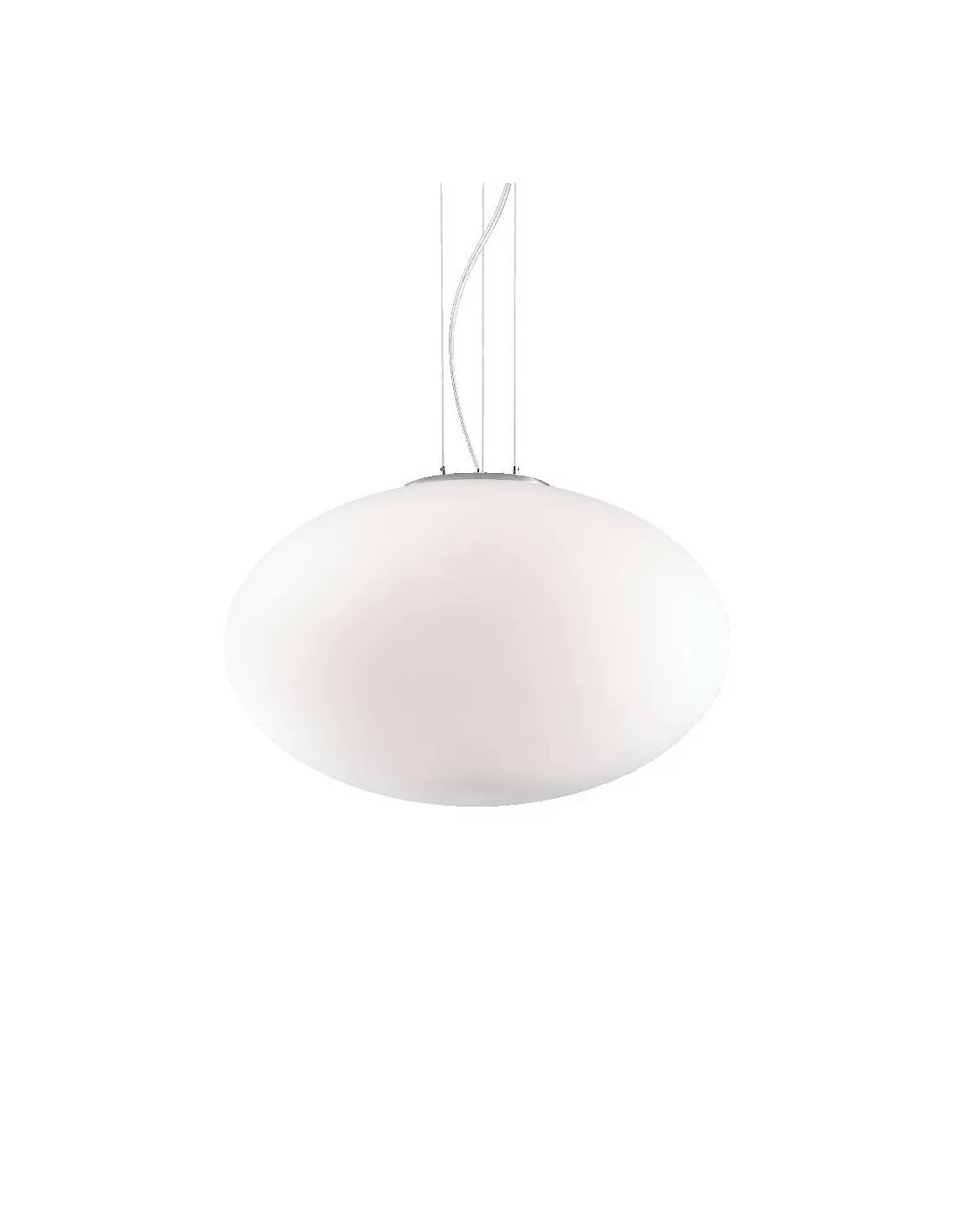 Lampadario moderno delle dimensioni di 50 cm di diametro x 228 cm di altezza ( cavo incluso), con diffusore in vetro bianco soffiato e acidato e montatura in metallo con finitura in nickel satinato.