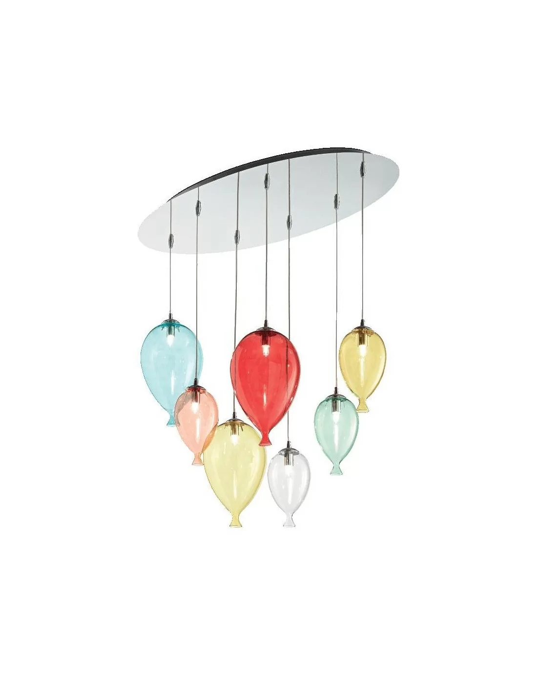 Lampadario moderno delle dimensioni di 80 cm di diametro x 135cm di altezza (cavo incluso) e montatura in metallo cromato, composto da 7 luci, con diffusori in vetro soffiato multicolore modellato a mano.