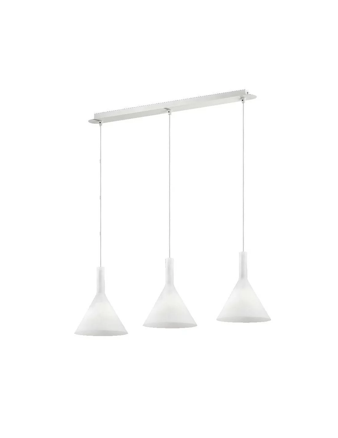 Lampadario moderno in stile minimal delle dimensioni di 82 cm di diametro x 125 cm di altezza (cavo incluso), con diffusori in vetro soffiato incamiciato e acidato nel colore bianco.