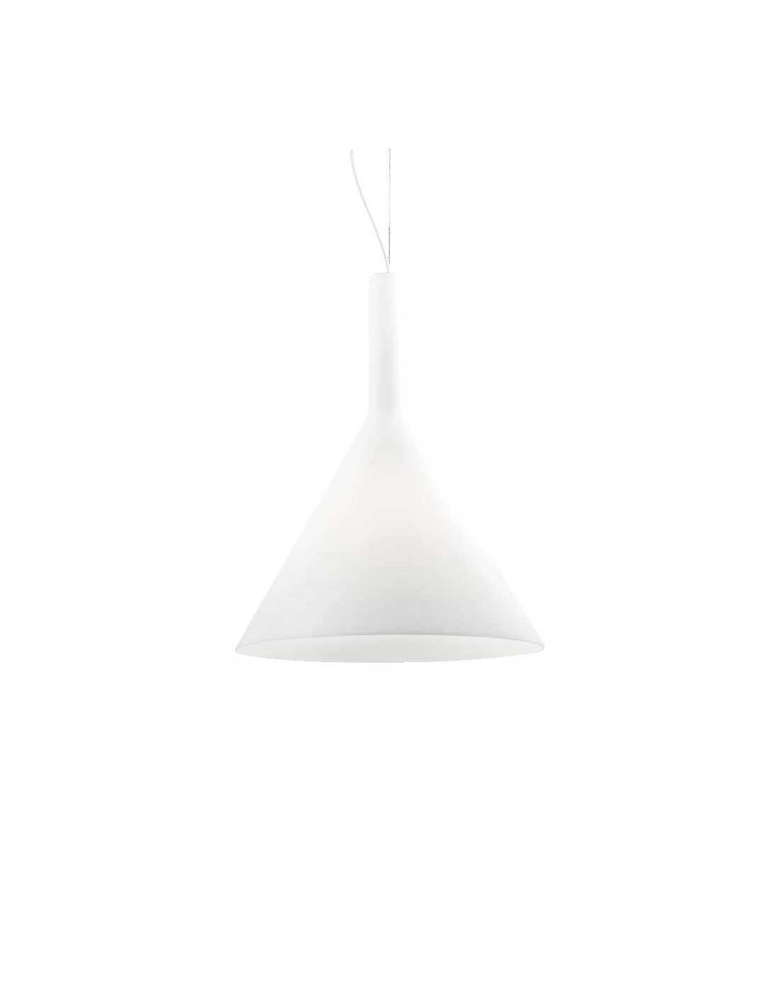 Lampadario moderno in stile minimal delle dimensioni di 35 cm di diametro x 248 cm di altezza (cavo incluso), con diffusore in vetro soffiato incamiciato e acidato nel colore bianco.