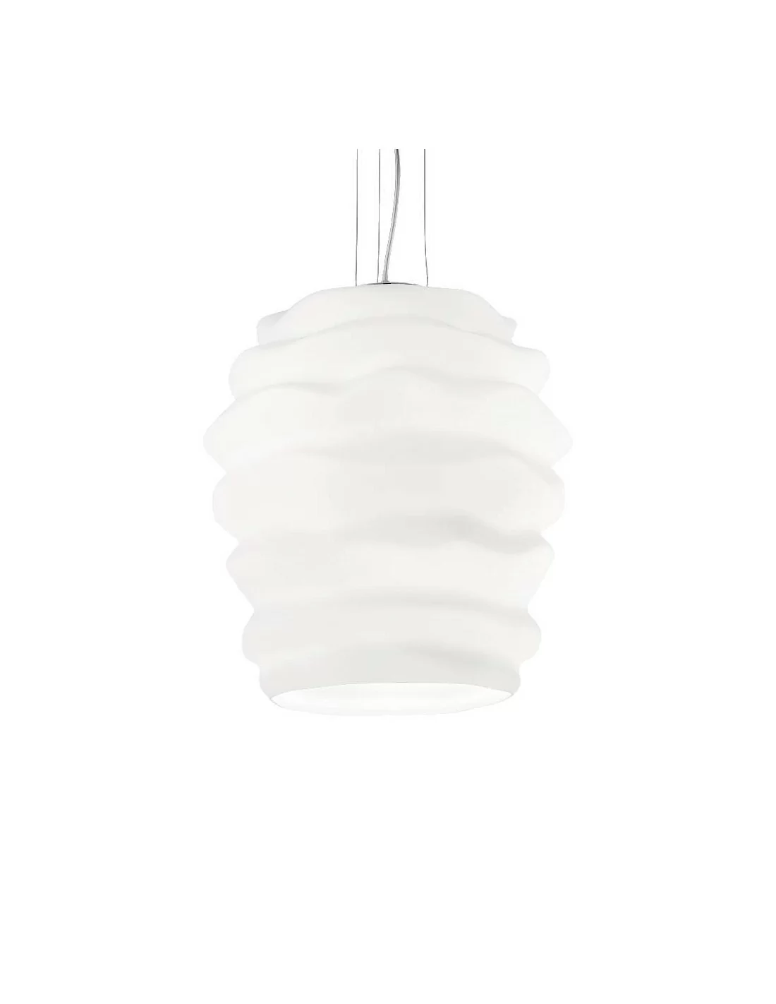 Questo lampadario delle dimensioni di 38 cm x 240 cm ( cavo incluso) si presenta con una montatura in metallo cromato e diffusore in vetro soffiato bianco incamiciato e acidato, con il suo stile è perfetto in ogni tipo di ambiente.