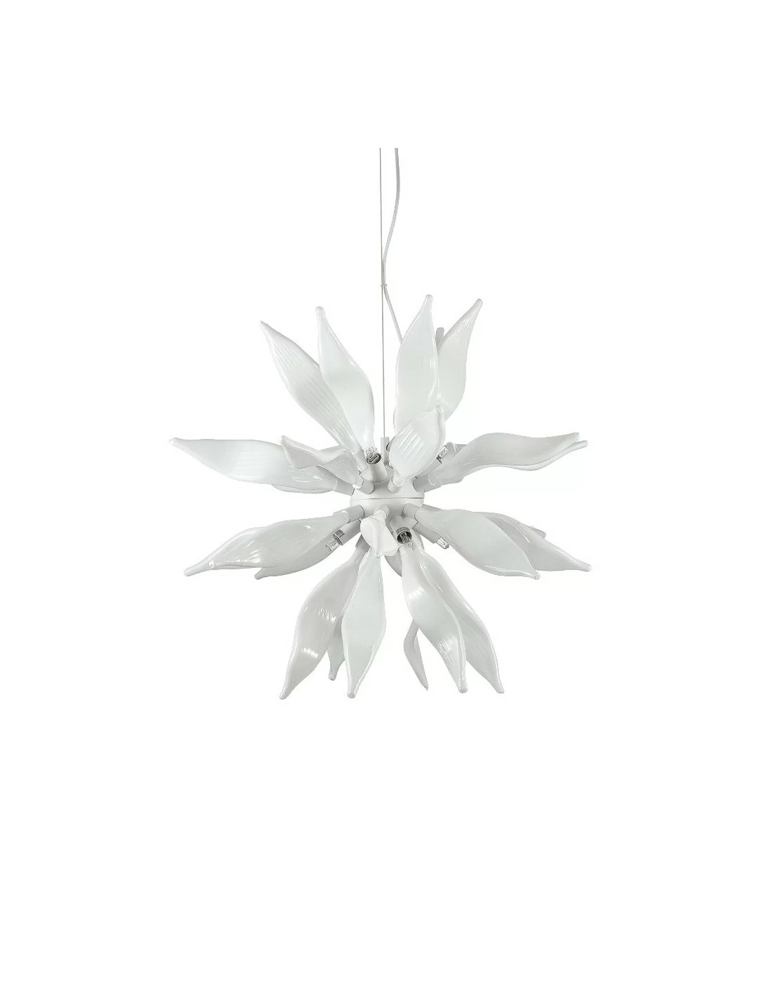 Lasciati incantare dalla bellezza delicata del lampadario moderno Ideal Lux Leaves SP8. La sua montatura in metallo bianco accoglie con eleganza gli elementi decorativi in vetro soffiato bianco e modellato a mano, creando un gioco di luci e ombre suggestivo.