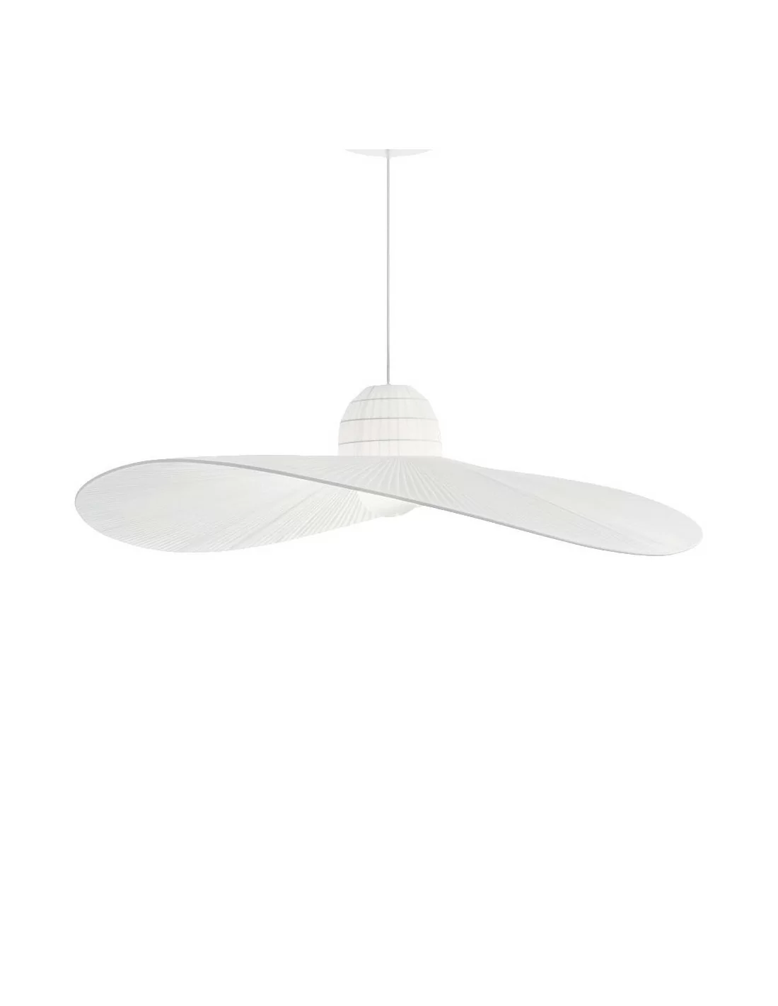 Lampadario moderno delle dimensioni di 110 cm di diametro, con rosone in metallo verniciato opaco e diffusore con telaio metallico avvolto da nastro in tessuto di raso nelle varianti colore: bianco, avorio, nero.