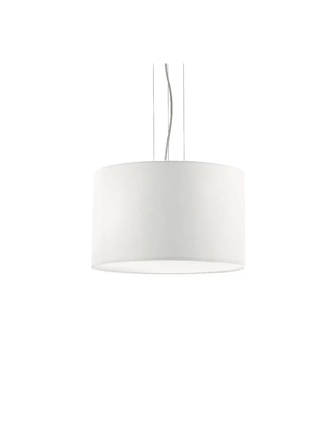 Lampadario dallo stile moderno con montatura circolare in metallo smaltato, caratterizzato da un delicato paralume in lamina di Pvc rivestita di tessuto delle dimensioni di 42,5 cm di diametro x 226 cm (cavo incluso), si adatta perfettamente a qualsiasi tipo di ambiente.