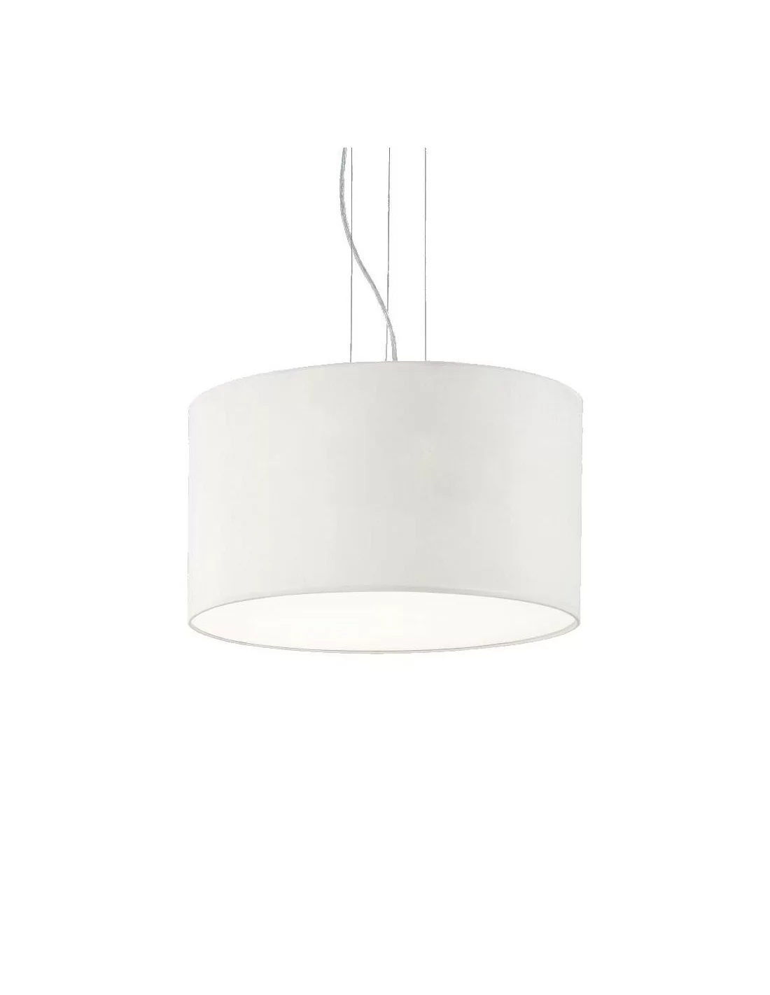 Lampadario dallo stile moderno con montatura circolare in metallo smaltato, caratterizzato da un delicato paralume in lamina di Pvc rivestita di tessuto delle dimensioni di 56,5 cm di diametro x 232,5 cm (cavo incluso), si adatta perfettamente a qualsiasi tipo di ambiente.