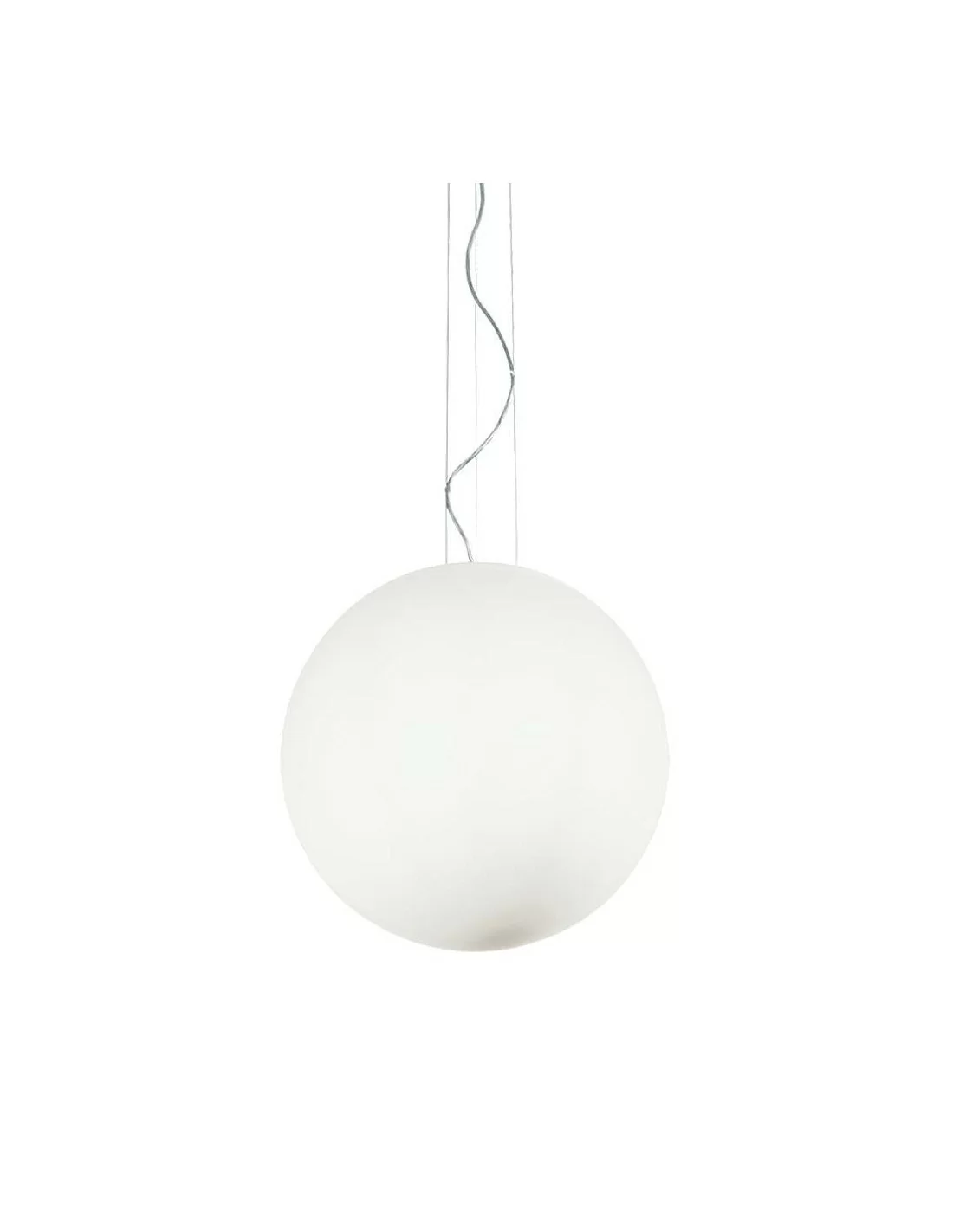 Lampada a sospensione moderna delle dimesioni di 50 cm di diametro x 250 cm ( cavo incluso), caratterizzato da una montatura in metallo cromato o bianco e caratterizzata da un diffusore in vetro soffiato disponibile nelle varianti colore: bianco soffiato e acidato o in vetro trasparente cromato con sfumatura verso il basso.