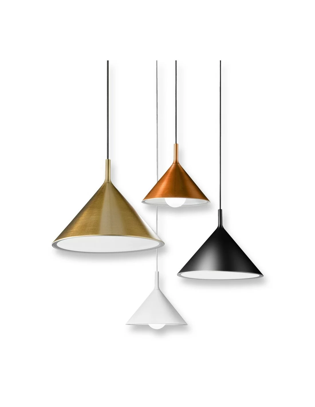 Questo lampadario dal design moderno, delle dimensioni di 40 cm di diametro x 190 cm ( cavo incluso), sfoggia una montatura in alluminio bianco opaco.