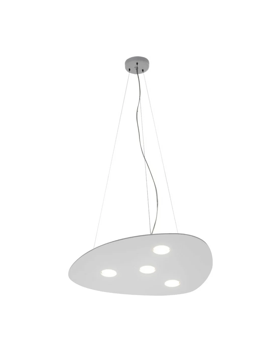 Questa sospensione moderna dalla forma tondeggiante, dimensioni di 74 cm x 62 cm, sfoggia una struttura in metallo arricchita da un pannello sottile in PMMA disponibile nelle finiture: bianco, nero.