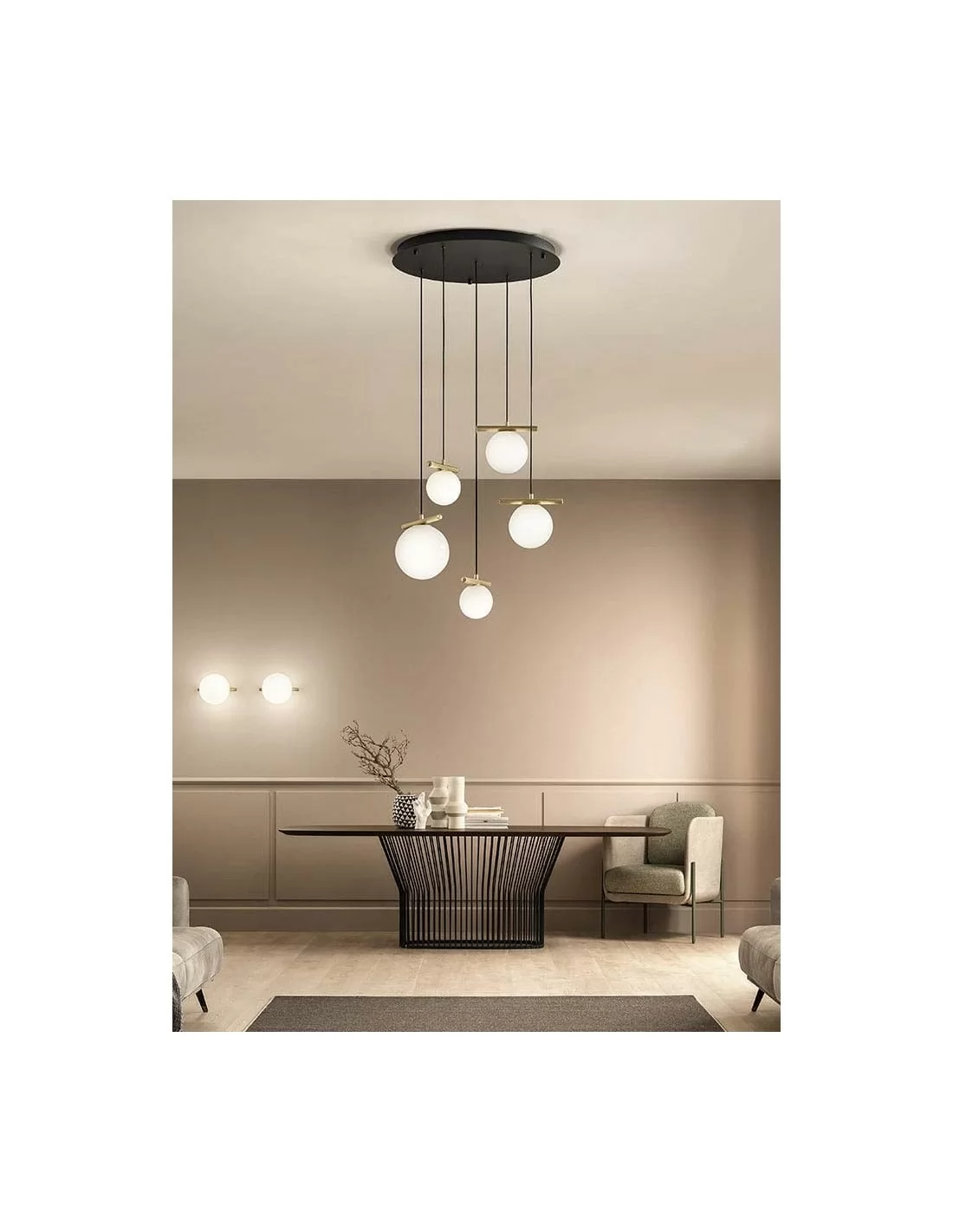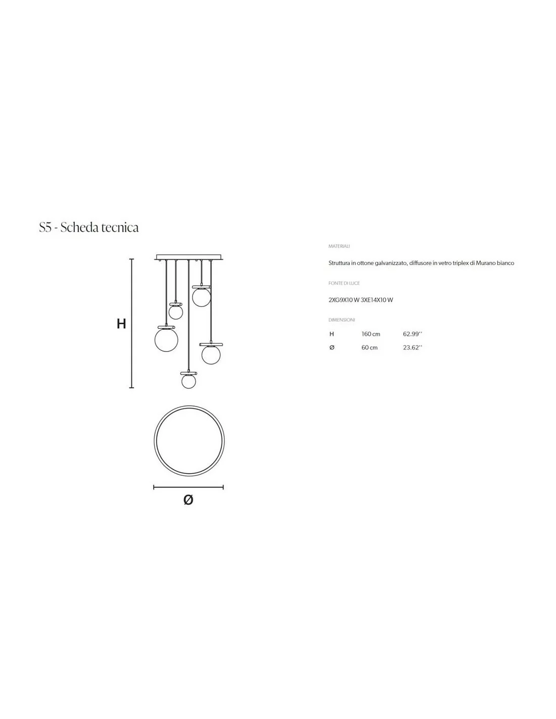 Le cinque sfere (in vetro triplex di Murano) che lo compongono diffondono una luce calda e avvolgente, creando un'atmosfera romantica e accogliente, che avvolge chiunque lo ammiri.