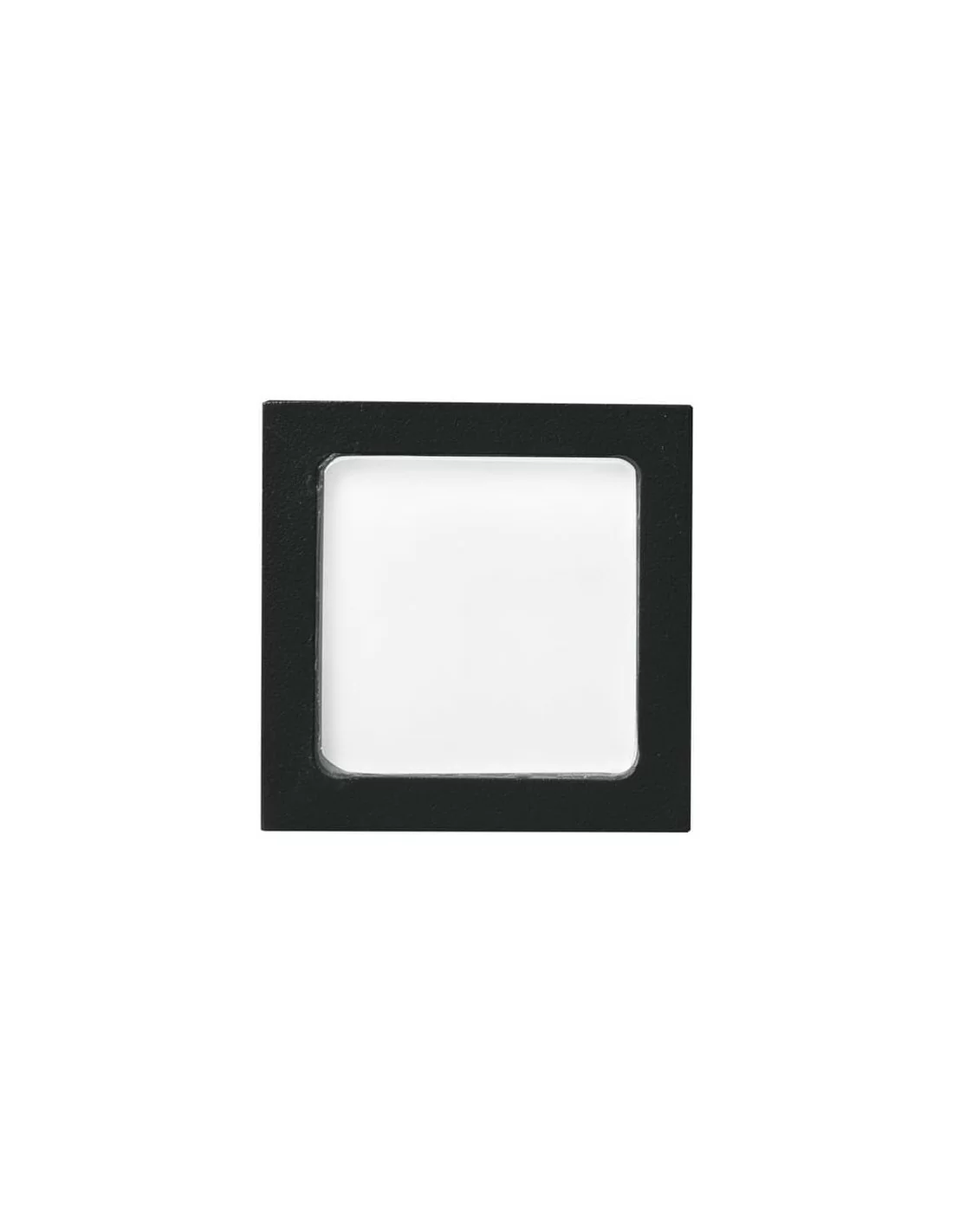 Faretto ad incasso led per esterni delle dimensioni di 4cm x 4cm con struttura in pressofusione di alluminio con cornice in alluminio di colore nero e diffusore in vetro trasparente.