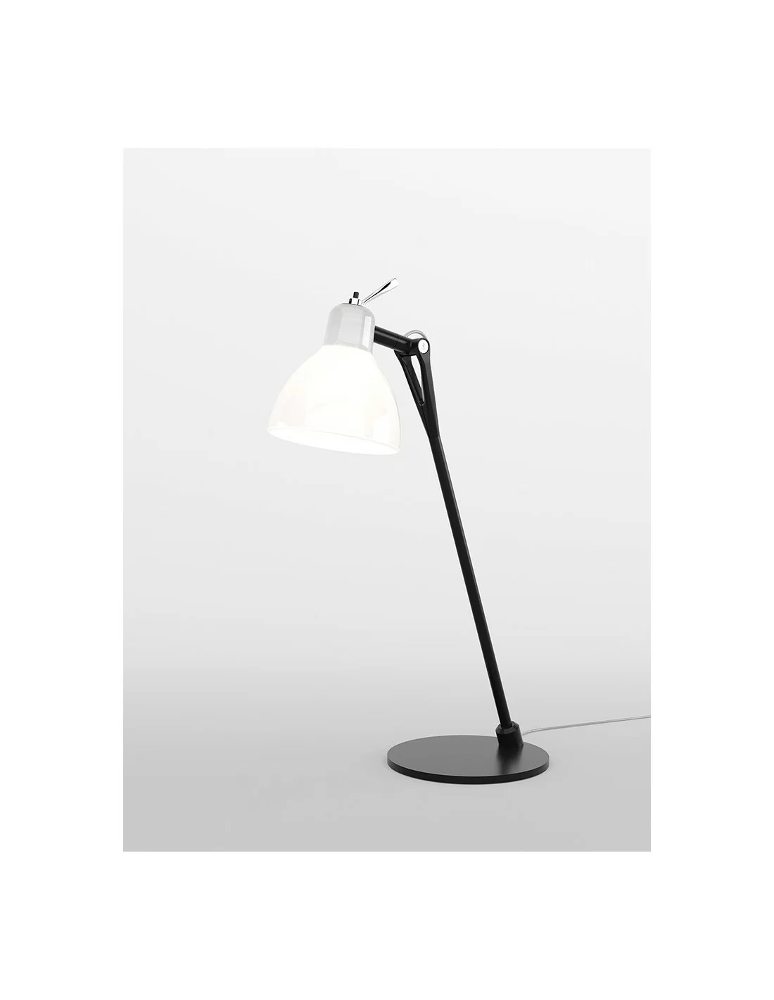 Lampada da tavolo con struttura in alluminio verniciato nella colorazione nero metallizzato, dal design moderno, con base delle dimensioni di 18cm di diametro x 52cm, caratterizzata da un diffusore in vetro trattato con vernici colorate nelle finiture: bianco lucido, oro lucido, rame lucido, fumè.
