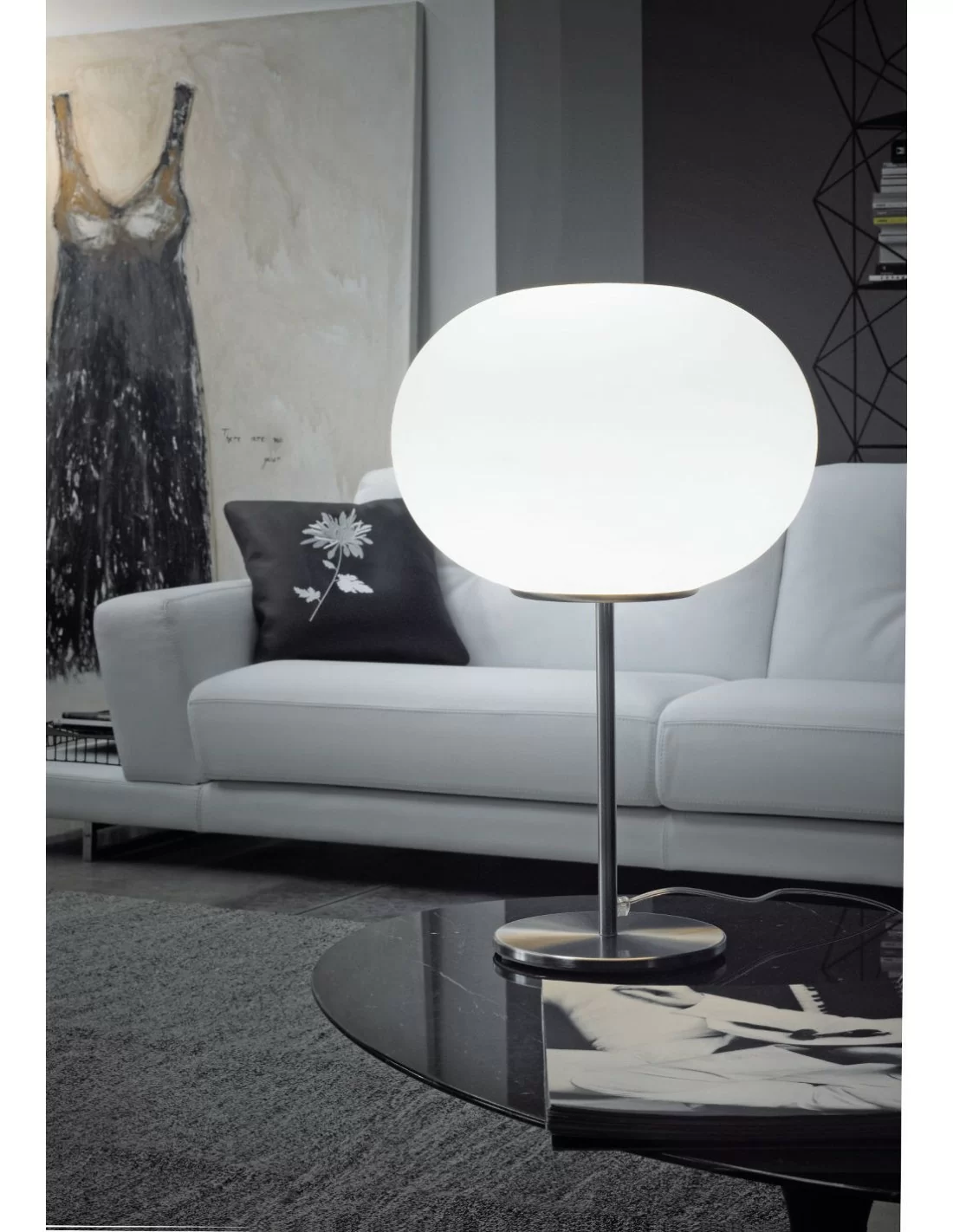 Lampada moderna da tavolo, la sua forma ovale in vetro soffiato satinato è disponibile in diverse dimensioni.