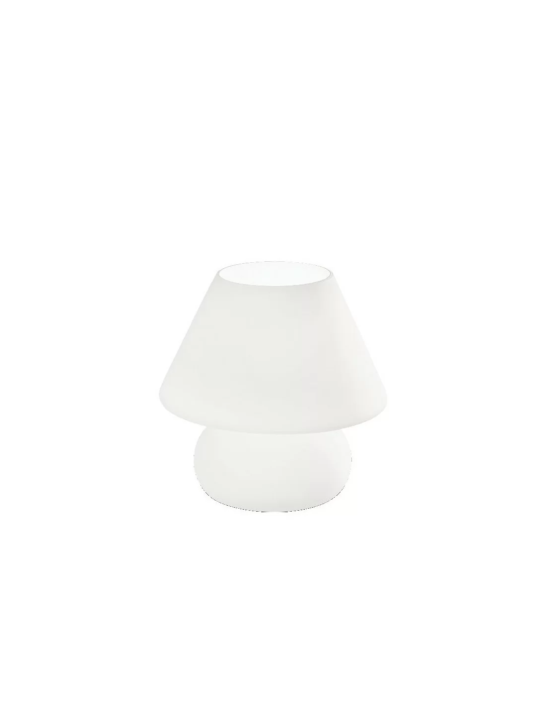 Lampada da comodino moderna di colore bianco con diffusore in vetro soffiato bianco incamiciato e acidato dalla caratteristica forma a funghetto delle dimensioni di 18,5 cm di altezza.