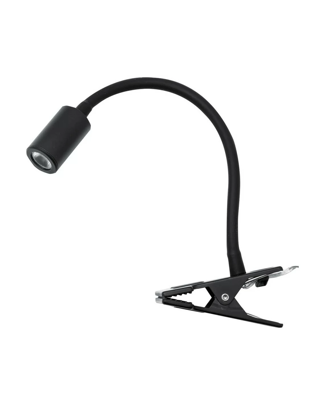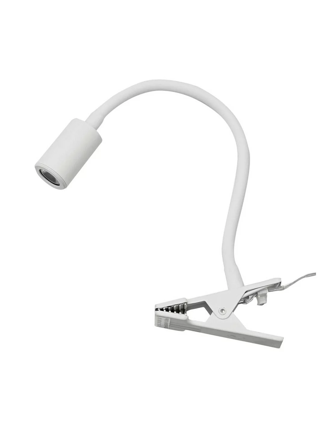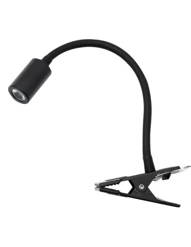 Lampada a led per lettura con pinza, dimensioni di 10 cm x 28 cm, con braccio flessibile direzionabile ricoperto da una guaina di colore nero restringente e diffusore disponibile nelle colorazioni: nero, bianco.