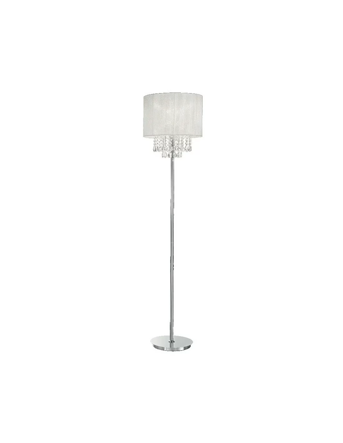 Lampada da terra classica, montatura in cromo,paralume in lamina di PVC con riflessi metallizzati e rivestita da fili.