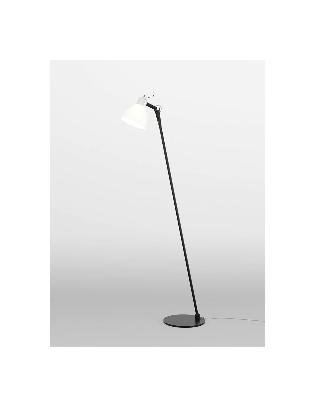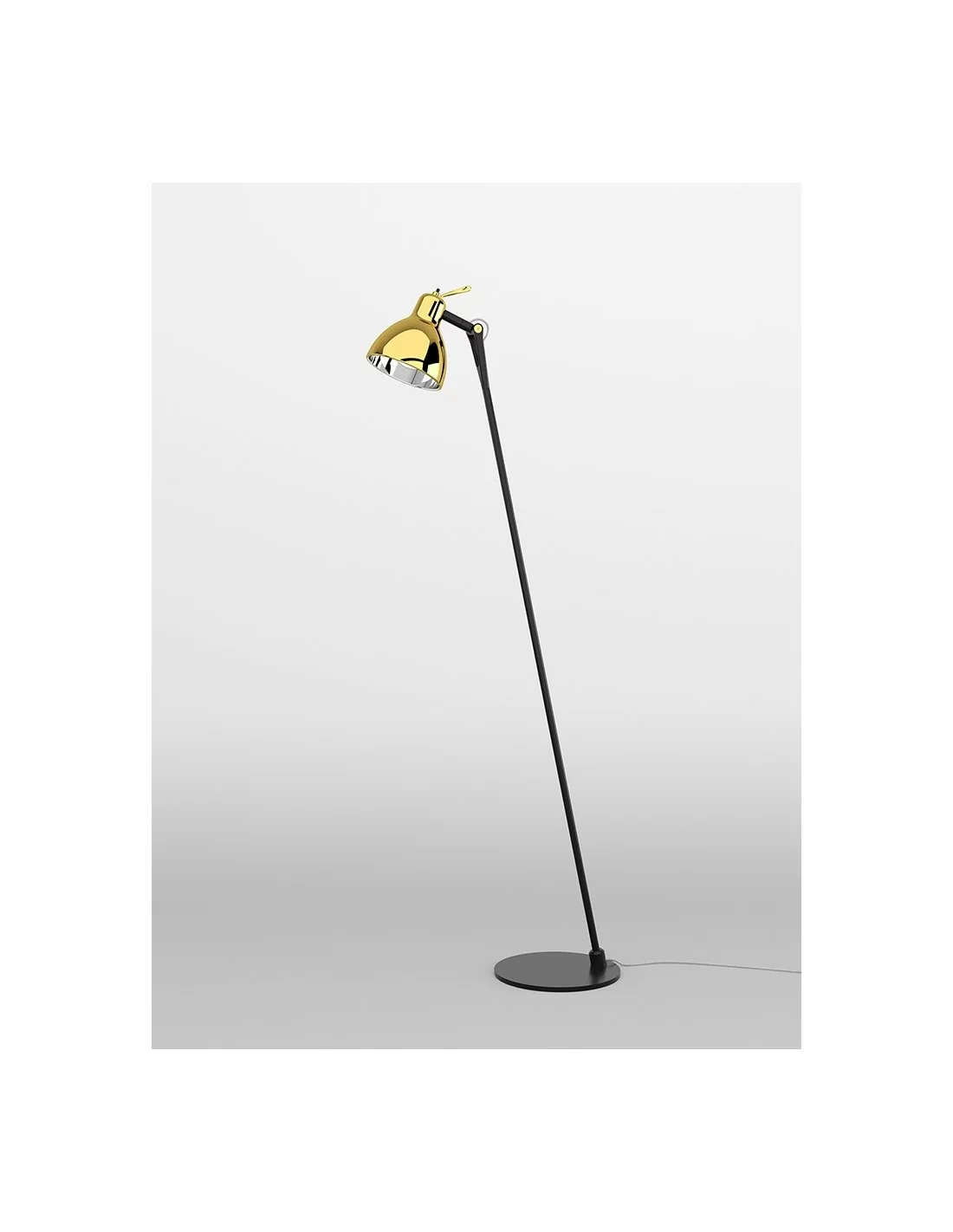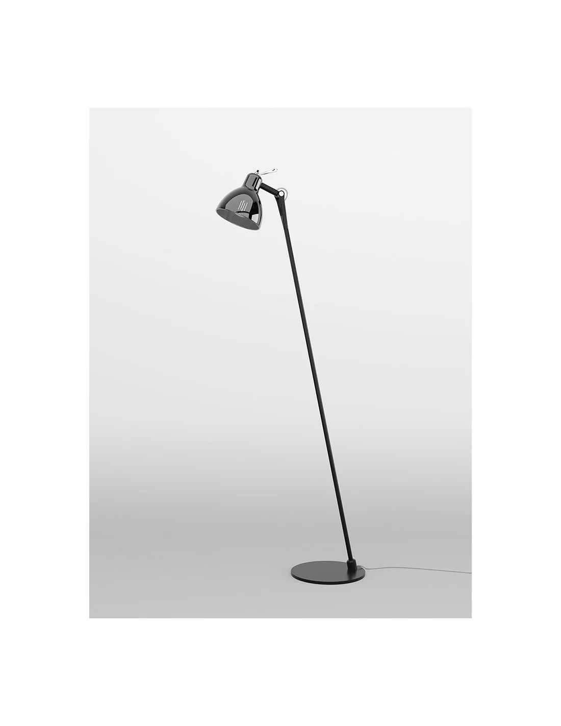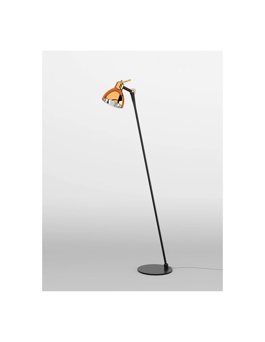 Piantana con struttura in alluminio verniciato nella colorazione nero metallizzato, dal design moderno, con base delle dimensioni di 22cm di diametro, caratterizzata da un diffusore in vetro trattato con vernici colorate nelle finiture: bianco lucido, oro lucido, rame lucido, fumè.