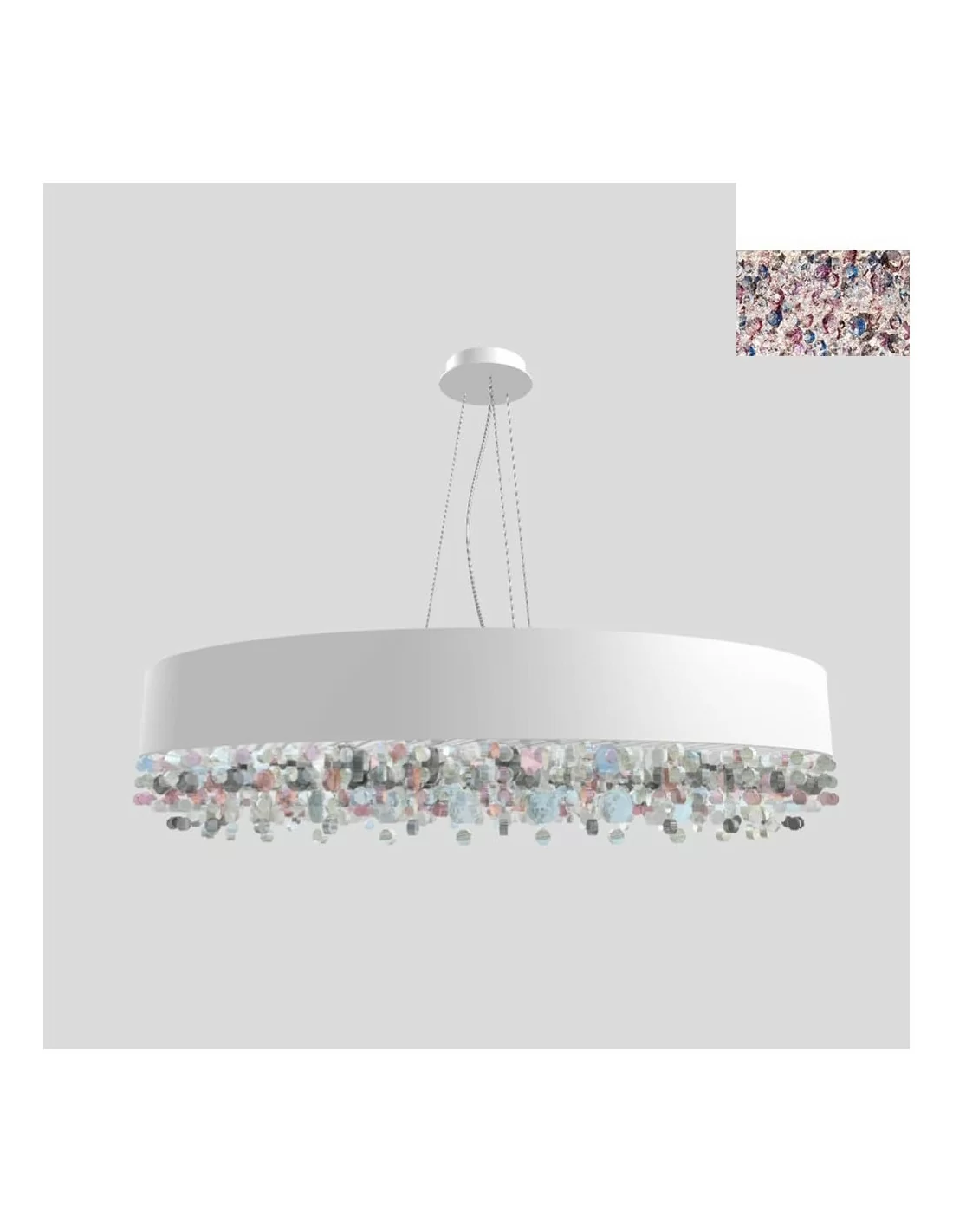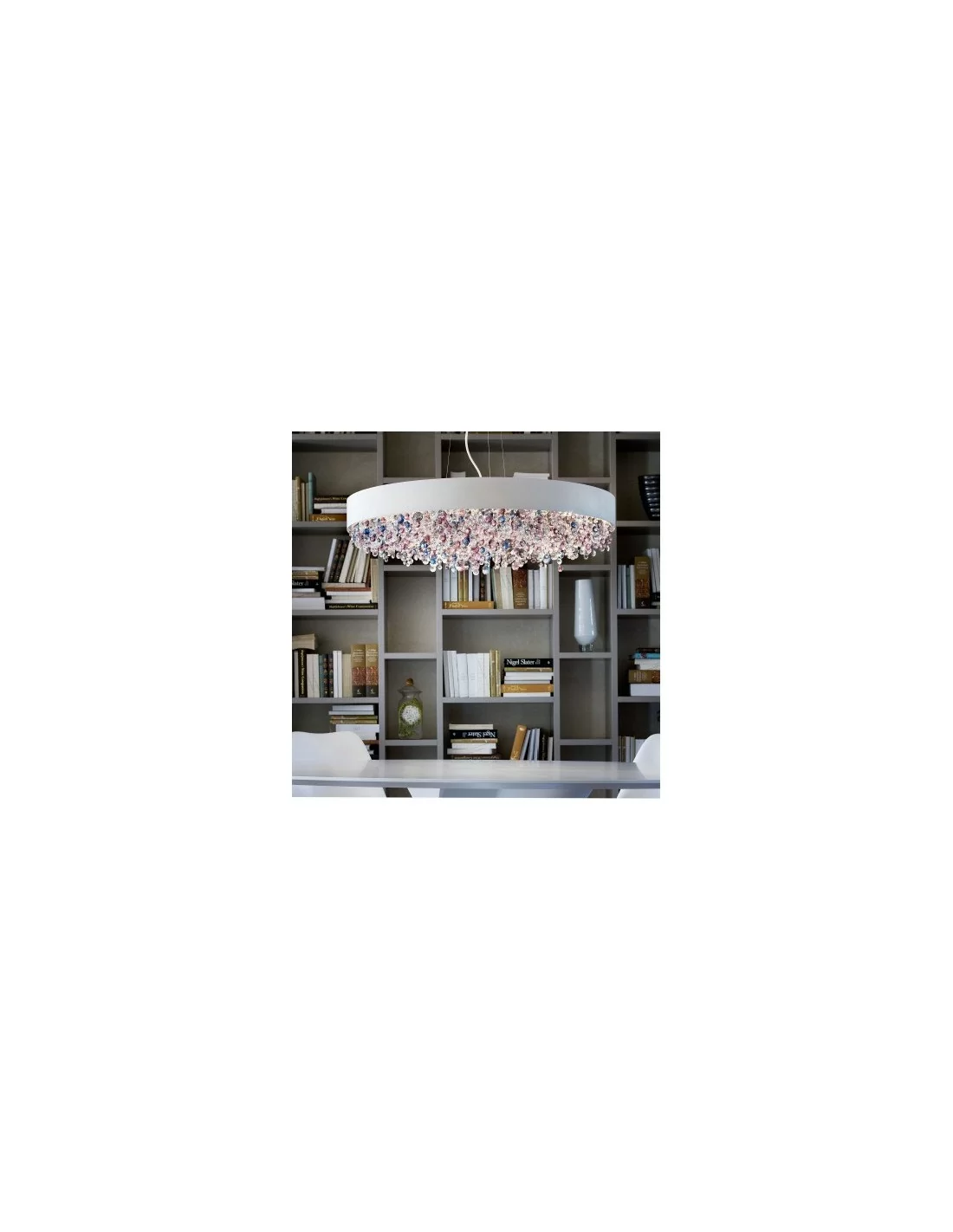 Impossibile non lasciarsi conquistare dal suo design elegante e ricercato: la struttura invisibile allo sguardo è una base da cui affiorano decine di pendenti in vetro italiano. La possibilità di scegliere tra una versione con pendagli colorati o trasparenti, ambra o fumé permette di avere flussi luminosi esclusivi e stupendi giochi di colore. La struttura è sorretta da una fascia portante esterna che può essere scelta con finitura bianca, bronzo, foglia oro, foglia argento o foglia rame.