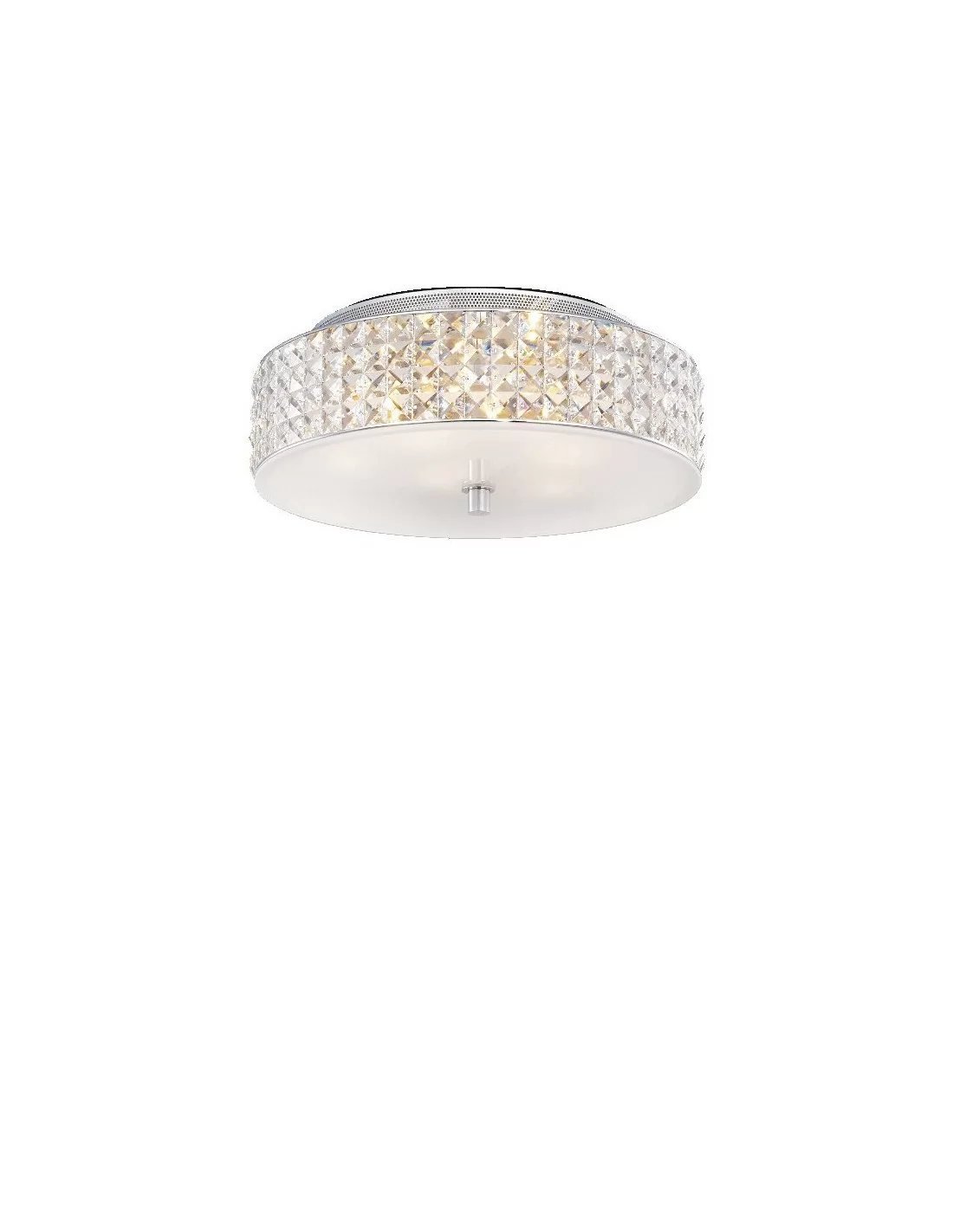 Questo lampada da soffitto dallo stile moderno delle dimensioni di 40 cm di diametro x 13 cm di altezza si presenta con una montatura e dei dettagli in metallo cromato, mentre il diffusore è arricchito con elementi quadrati in cristallo molato sulla fascia laterale e un vetro sabbiato sul fondo.