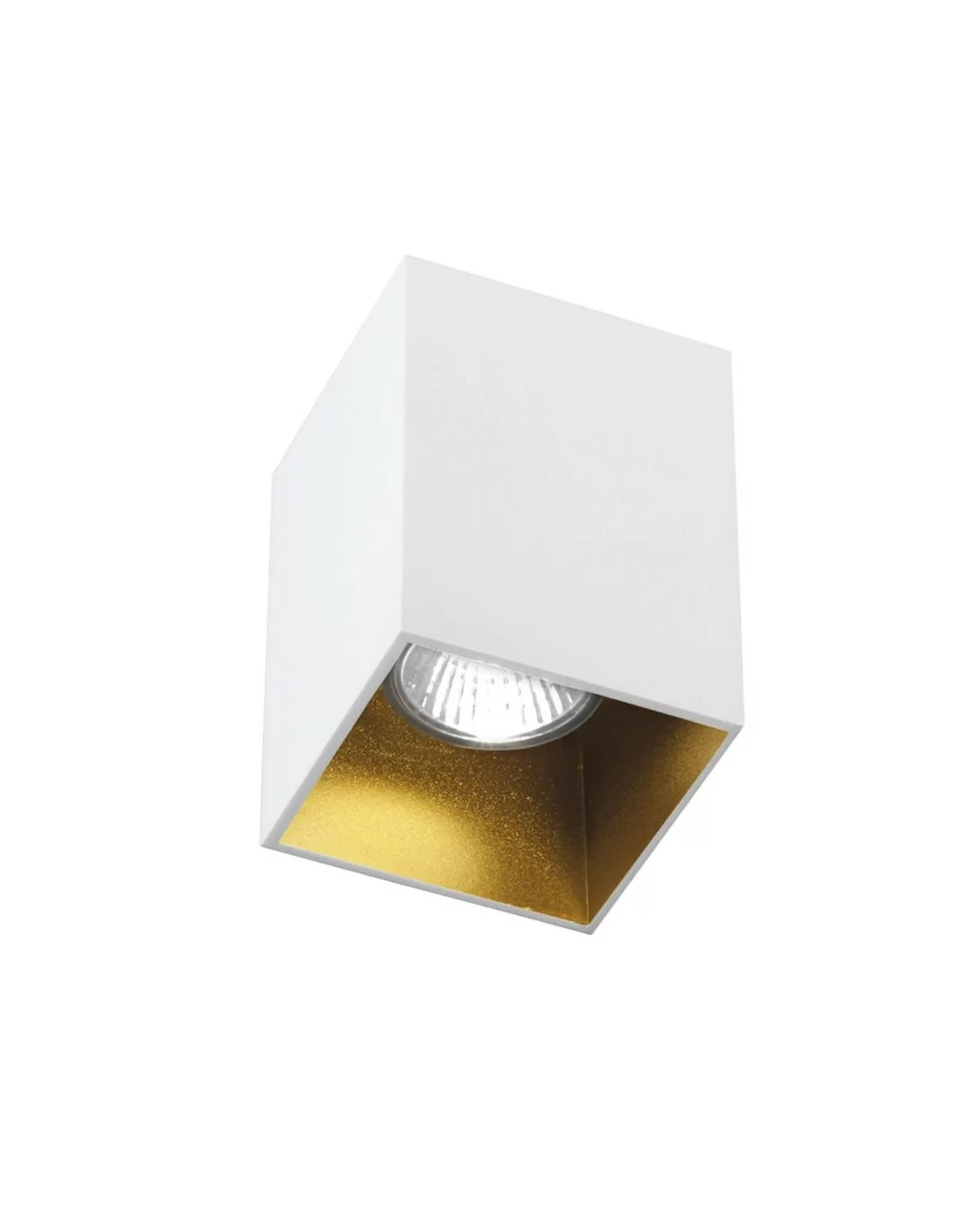 Plafoniera con attacco GU10. Struttura quadrata, in pressofusione di alluminio bianco all'esterno e oro satinato all'interno.