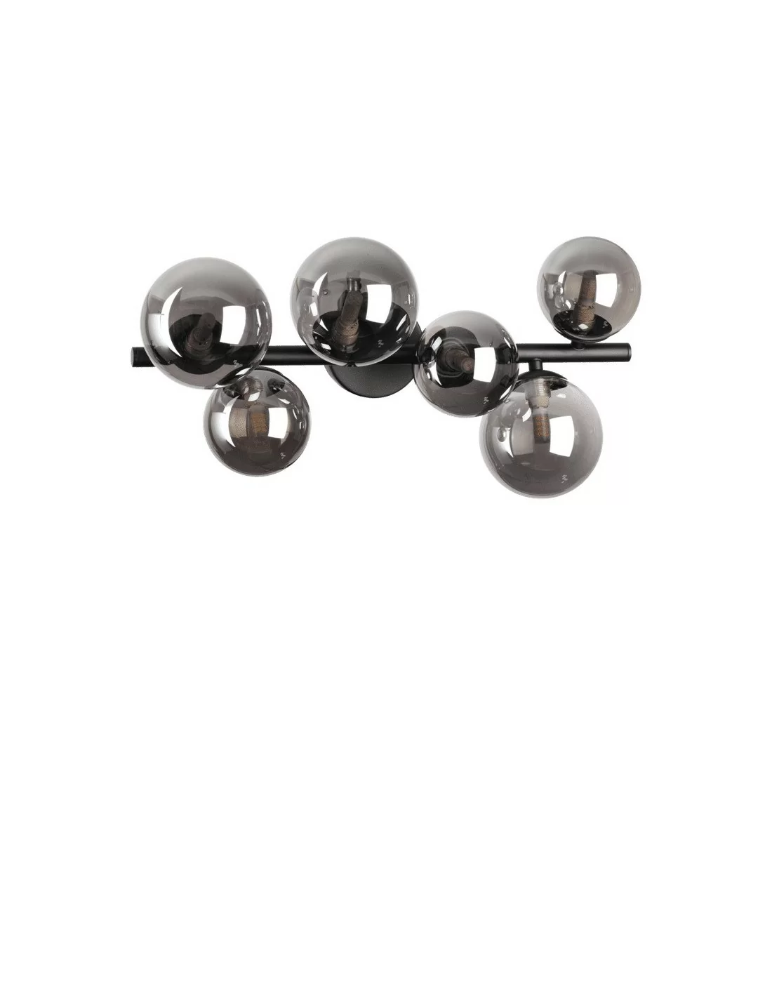 Questa lampada da soffitto classica, dimensioni di 49 cm x 19,5 cm, è caratterizzata da una montatura in metallo con struttura lineare a sezione quadrata e diffusori in vetro fumè.