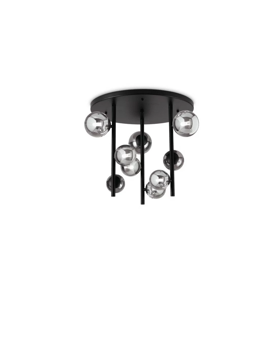 Questa lampada a soffitto classica, dimensioni di 55 cm x 55 cm, è caratterizzata da una montatura in metallo con struttura lineare a sezione tonda e diffusori in vetro fumè.